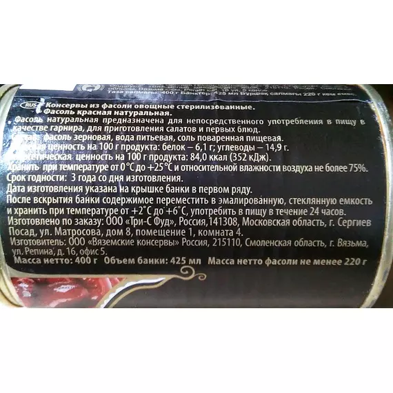 фасоль зерновая, вода питьевая, соль пищевая повареная