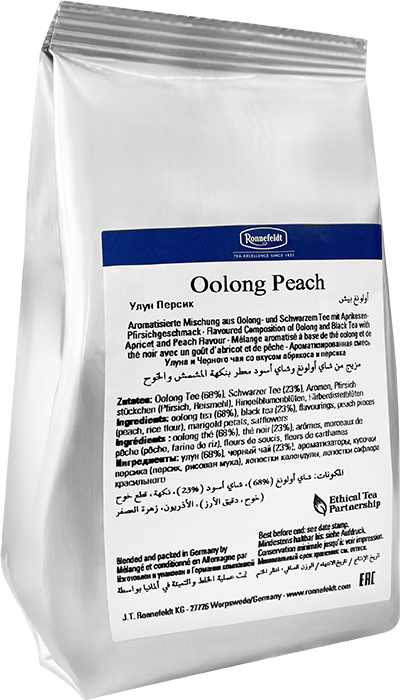 Чай черный Ronnefeldt Персиковый Улун – изысканная смесь улуна (68%) и черного чая (23%) с ароматными кусочками спелого персика, лепестками календулы и сафлора.