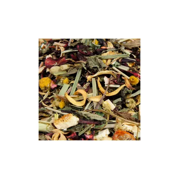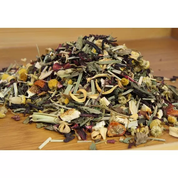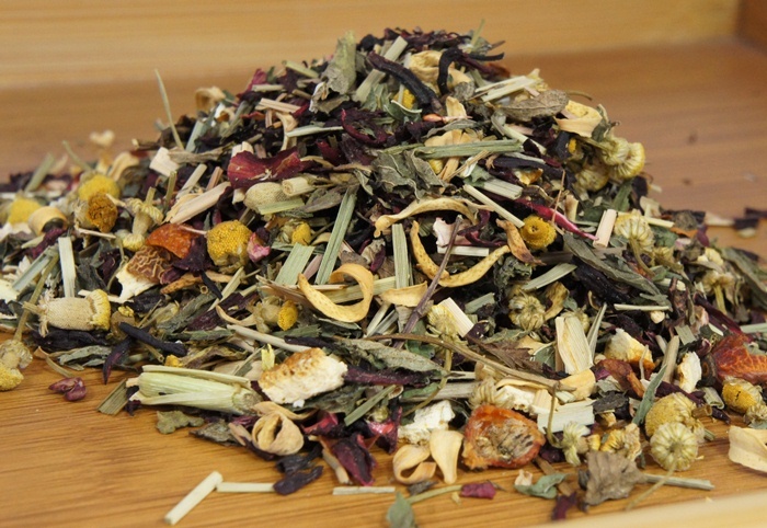 Травяной чай ароматный и полезный напиток, в состав которого входят мята, мелиса, плоды шиповника и аронии, цедра апельсина, лимонная трава, листья клубники, цветы ромашки и каркаде. Французы называют такие смеси «tisane» и относят к разряду фиточаев.