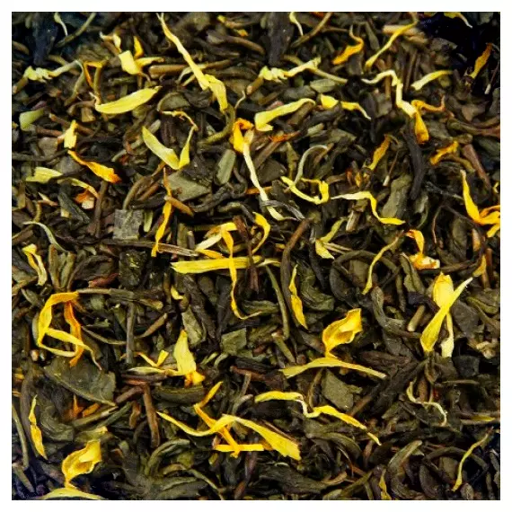 Свежий зеленый чай с Сенчей, натуральными кусочками саусепа и цветочными лепестками.