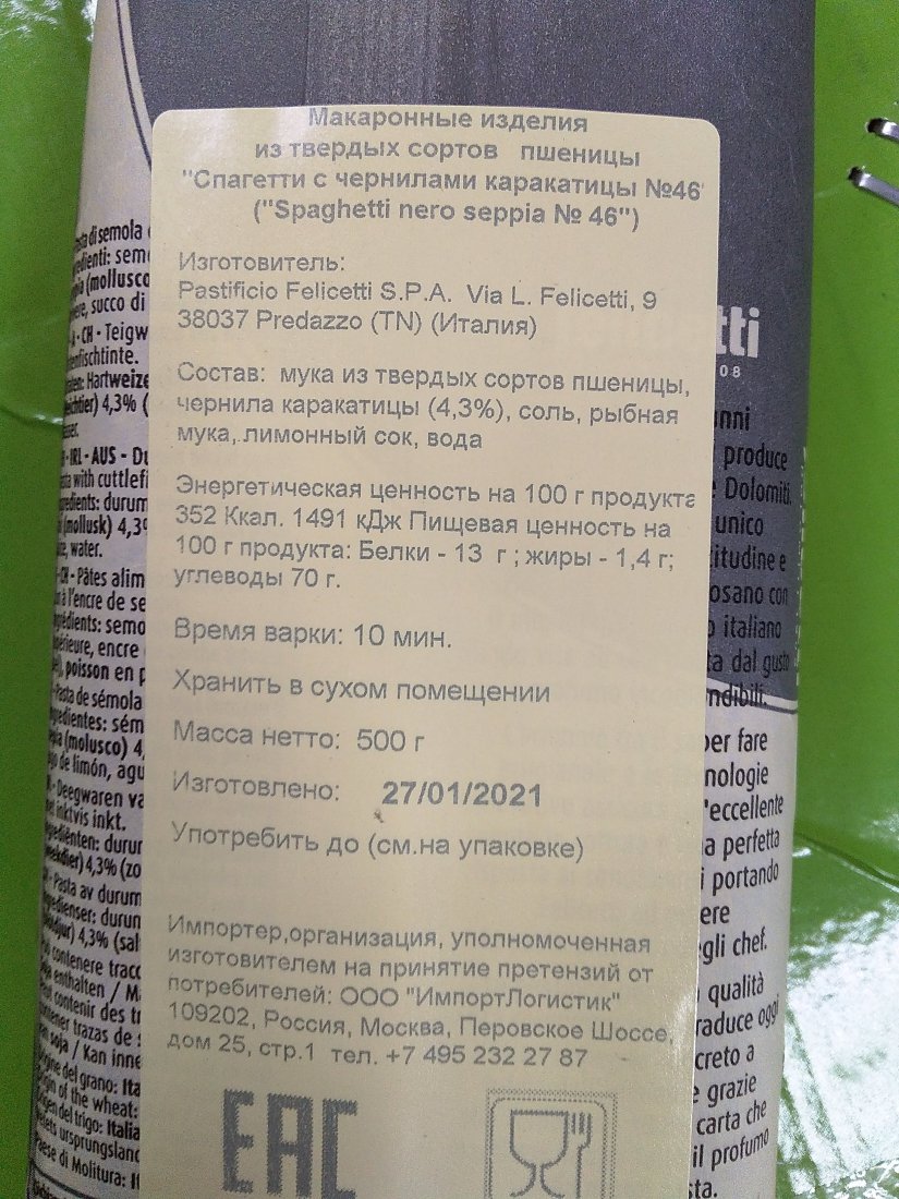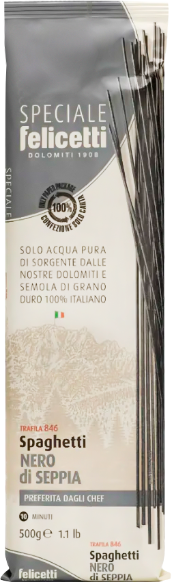 Макаронные изделия Felicetti Spaghetti с чернилами каракатицы отлично сочетаются с сыром, овощными и сливочными соусами, их подают с мясом, а также морепродуктами. Дополните приготовленное блюдо соусами Карбонара и Болоньезе.