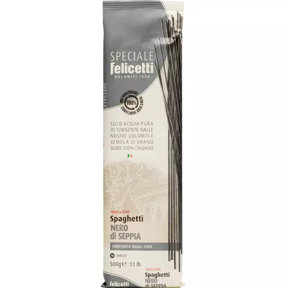 Макаронные изделия Felicetti Spaghetti с чернилами каракатицы отлично сочетаются с сыром, овощными и сливочными соусами, их подают с мясом, а также морепродуктами. Дополните приготовленное блюдо соусами Карбонара и Болоньезе.