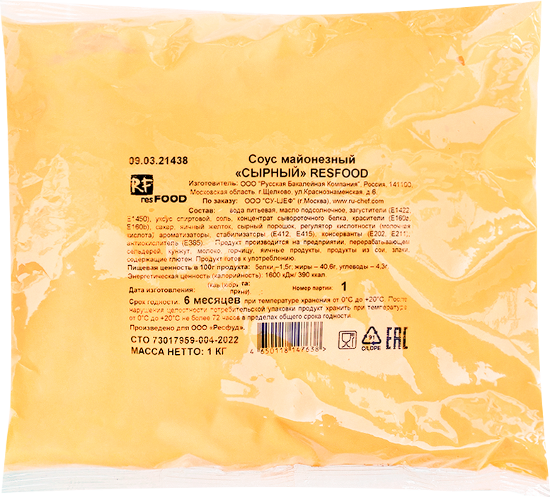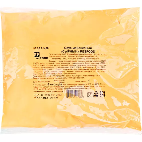 вода питьевая, масло подсолнечное, загустители (Е1422, Е1450), уксус спиртовой, соль, концентрат сывороточного белка, красители, сахар, яичный желток, сырный порошок, регулятор кислотности (молочная кислота), ароматизаторы, стабилизаторы (Е412, Е415), консерванты (Е202, Е211), антиокислитель (Е385). Продукт производится на предприятии, перерабатывающем сельдерей, кунжут, молоко, горчицу, яичные продукты, продукты из сои, злаки содержащие глютен.