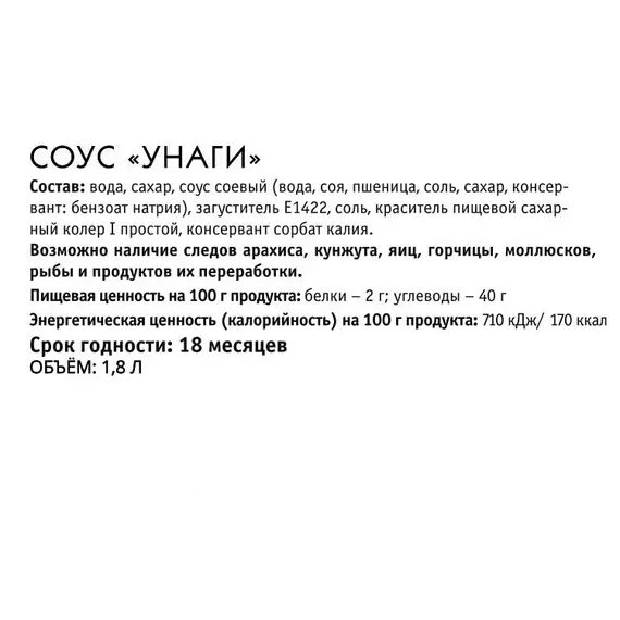 вода, сахар, соус соевый (вода, соя, пшеница, соль), загуститель Е1422, соль, краситель пищевой сахарный колер, консервант сорбат калия.
