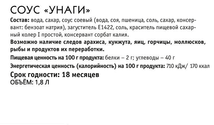 вода, сахар, соус соевый (вода, соя, пшеница, соль), загуститель Е1422, соль, краситель пищевой сахарный колер, консервант сорбат калия.