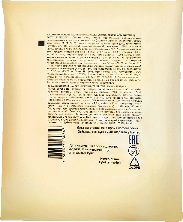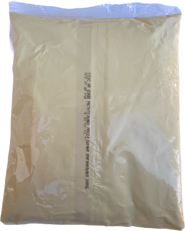 вода, масло подсолнечное рафинированное дезодорированное, продукты яичные, сыр (содержит лактозу, уплотнитель Е509), загустители (Е1422, Е415), сахар, соль, регулятор кислотности Е260, ароматизатор натуральный, сок лимонный концентрированный, консервант Е202, красители (Е100, Е160с), антиокислитель Е385