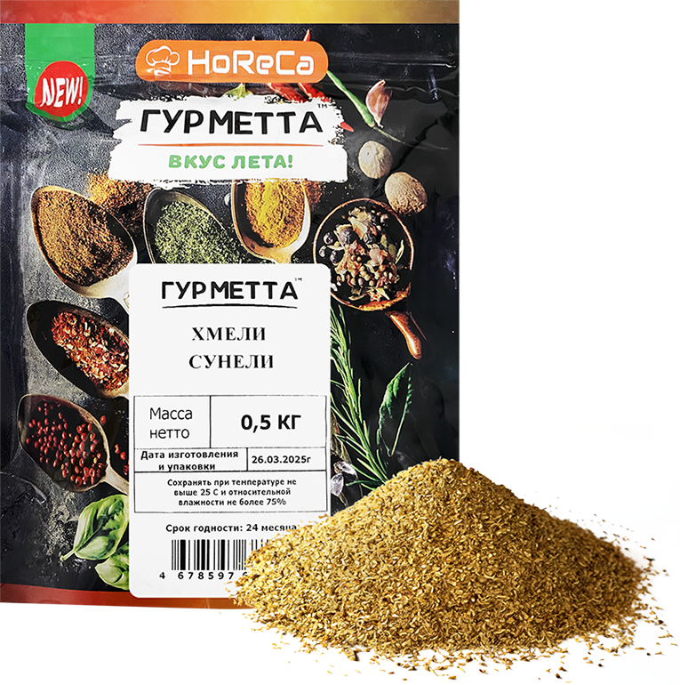 Приправа «Хмели-сунели» — традиционная грузинская смесь трав и специй, придающая блюдам насыщенный аромат и пикантный вкус. В её состав входят базилик, душистый перец, майоран, кориандр, тимьян и другие компоненты, которые дополняют друг друга и усиливают вкус мяса, овощей и супов.