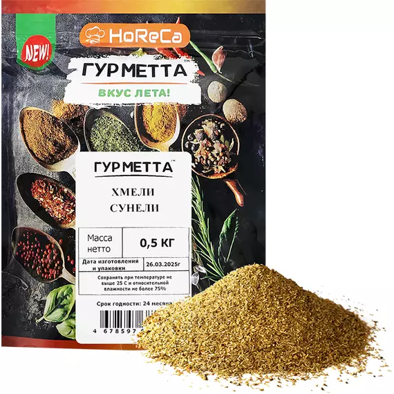 Приправа «Хмели-сунели» — традиционная грузинская смесь трав и специй, придающая блюдам насыщенный аромат и пикантный вкус. В её состав входят базилик, душистый перец, майоран, кориандр, тимьян и другие компоненты, которые дополняют друг друга и усиливают вкус мяса, овощей и супов.