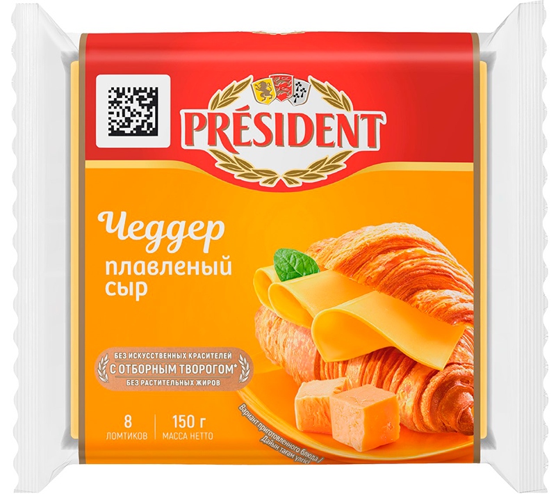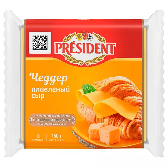 Сыр плавленый Чеддер President жирность 40%, ломтики 8 шт, 150 г