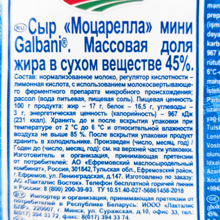 Сыр Моцарелла мини Galbani жир.45% дой-пак 150 г