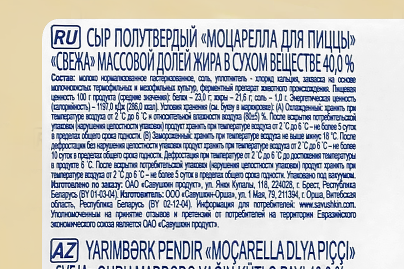 Моцарелла - молодой сливочный сыр итальянского происхождения, делается на основе коровьего молока. Сыр плотный, эластичный и тягучий по своей текстуре, хорошо переносит высокие температуры, отлично подходит для пиццы.