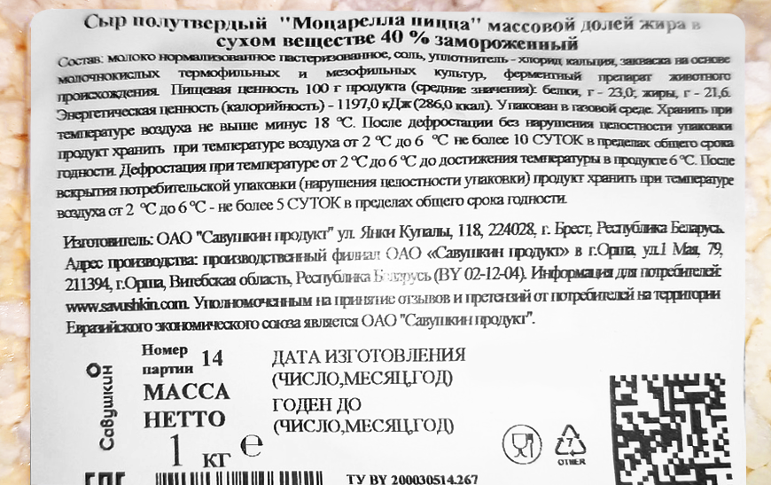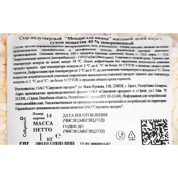 Сыр Моцарелла Савушкин "Свежа" жирность 40% свежемороженый кубик, вес 1 кг