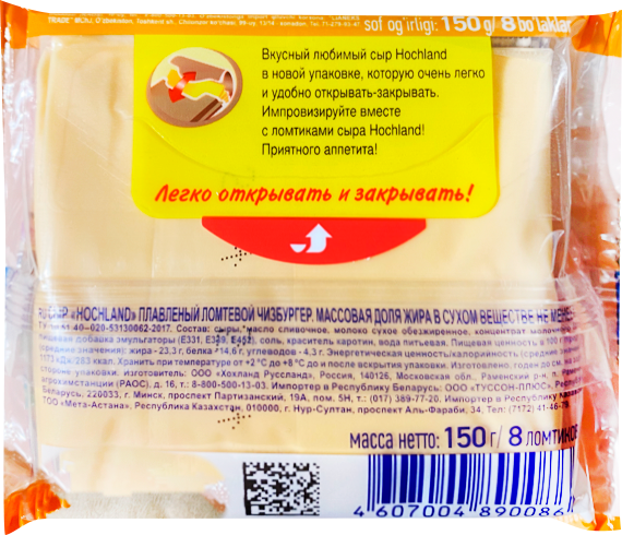Оптимальная толщина и вес каждого ломтика в удобной укладке снижает себестоимость и повышает качество готового блюда, благодаря чему сыр «Хохланд чизбургер» признан всеми ведущими сетями ресторанов быстрого обслуживания в России, а компания Hochland является одним из самых крупных в мире поставщиков ломтиков плавленого сыра для HoReCa.