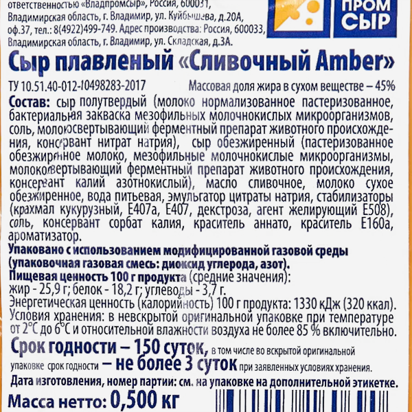 Сыр плавленый Сливочный Амбер жирность 45%, ломтики 500 г, 40 ломтиков в упаковке