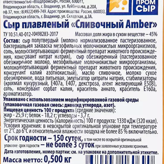 Сыр полутвердый (молоко нормализованное пастеризованное, бактериальная закваска мезофильных молочнокислых микроорганизмов, соль, молокосвертывающий ферментный препарат животного происхождения, консервант нитрат натрия), сыр обезжиренный (пастеризованное обезжиренное молоко, мезофильные молочнокислые микроорганизмы, молкосвертывающий фермнетный препарат животного происхождения, консервант калий азотнокислый), масло сливочное, молоко сухое обезжиренное, вода питьевая, эмульгатор цитраты натрия, стабилизаторы (крахмал кукурузный, E407a, E407, декстроза, агент желирующий E508), соль, консервант сорбат калия, краситель аннато, краситель E160a, ароматизатор.