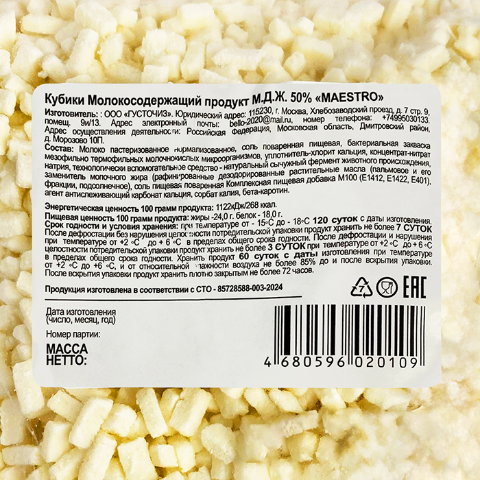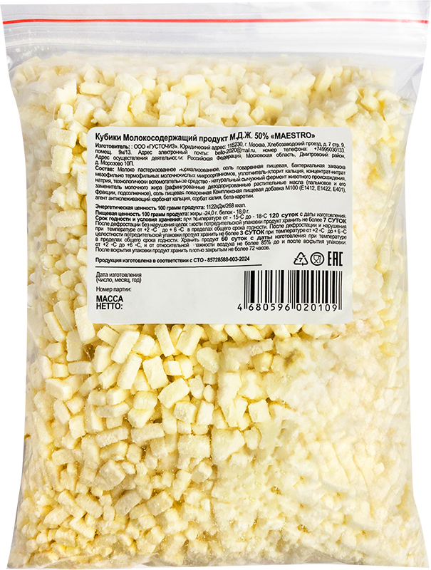 Сыр Моцарелла ФрэскоЧиз Pizza Cheese MAESTRO (Зелёная) ЗМЖ жир. 50% замороженный КУБИК, вес ~1 кг (1~10 кг)*