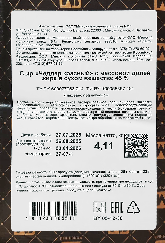 Упаковка: брус весом около 4 кг, что делает его удобным вариантом для кафе, ресторанов и крупных мероприятий. Производство ТМ «Молодея» гарантирует высокое качество, натуральность и стабильный вкус сыра.
