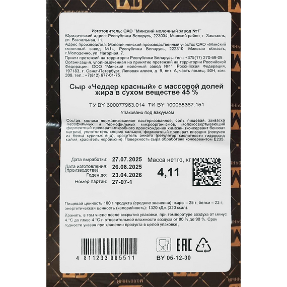 Сыр Чеддер Красный ТМ Молодея жир.45% брус ~4 кг
