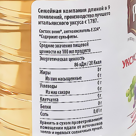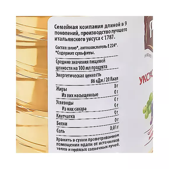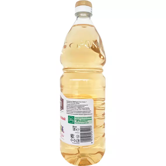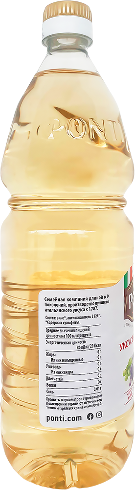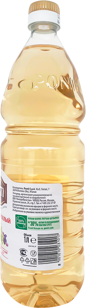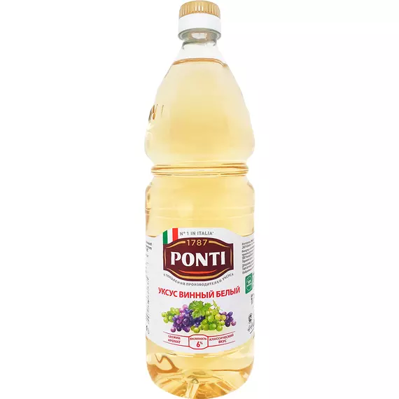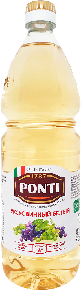 Белый винный уксус "Ponti" – нежно желтого цвета с золотистым оттенком. Вкус более сладкий, аромат более сложный и насыщенный чем у красного уксуса. Белый винный уксус делается из сухих белых вин, в отличии от красного брожение происходит в стальных бочках.