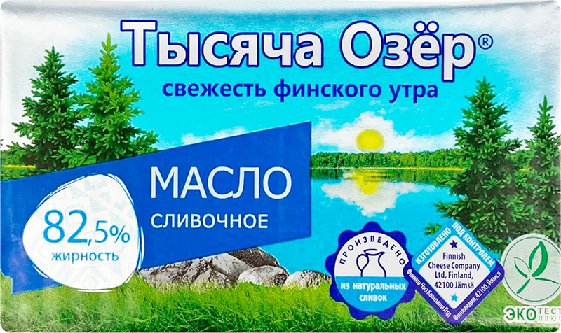 Масло Сливочное "Тысяча Озер" приготовлено в лучших финских традициях из натуральных пастеризованных сливок. Продукт богат витаминами и минеральными веществами и отличается нежным вкусом и легким сливочным ароматом. При изготовлении не используются искусственные добавки.