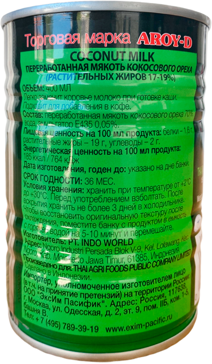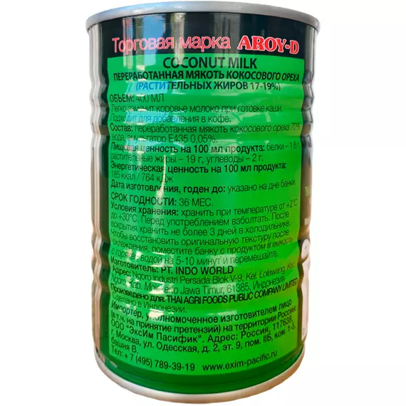 Молоко кокосовое, мякоть кокосового ореха переработанное Aroy-D, 0,400 л