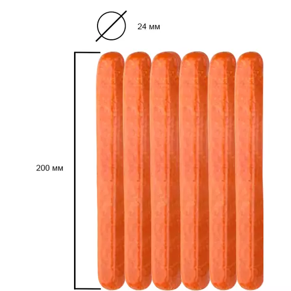 Сочная и нежная по текстуре говяжья сосиска для хот-дога. Форма и параметры: длина – 200 мм, диаметр 24 мм, вес – 80 гр.