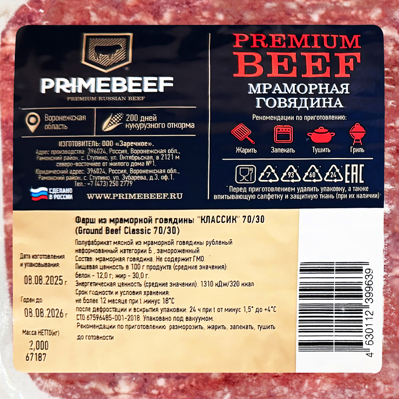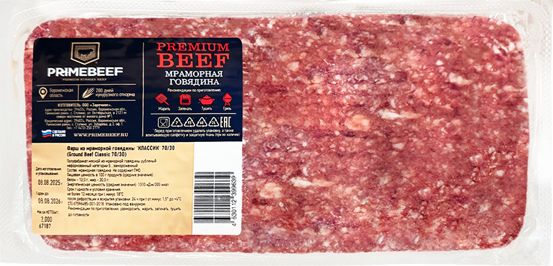 Фарш Праймбиф изготавливается из свежего мяса без добавления сои, консервантов и растительных компонентов. Продукт фасуется в герметичную вакуумную упаковку и подвергается быстрой заморозке, что сохраняет вкус, аромат и питательные свойства.