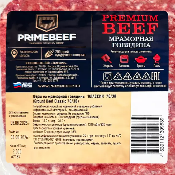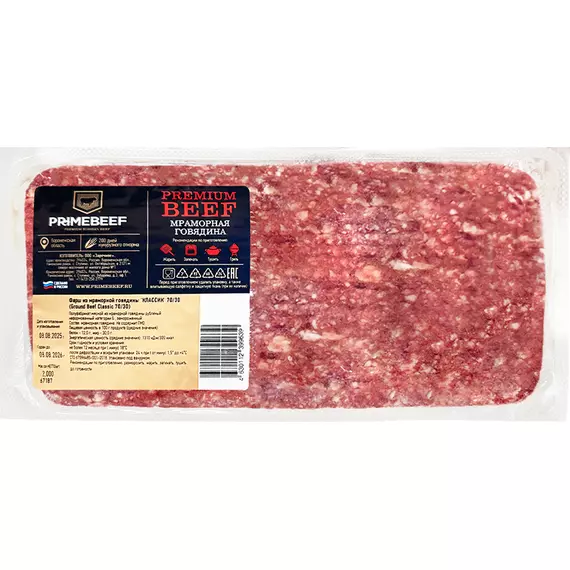 Фарш говяжий Классик (70/30) Праймбиф свежемороженая, вакуумная упаковка 2 кг