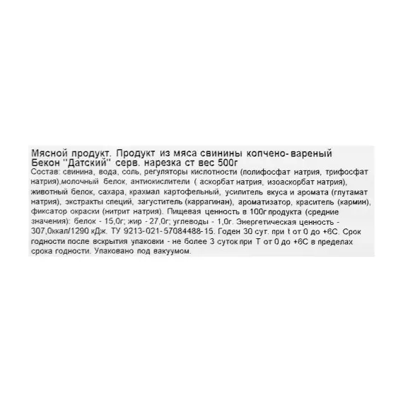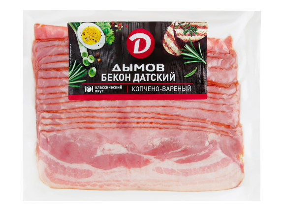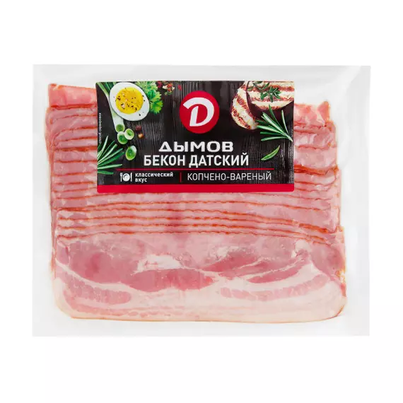 Бекон "Датский" Дымов нежный по своей текстуре, соленый с ароматом копчения, станет отличным дополнением для завтрака, в качестве закуски, салатов и других блюд.
