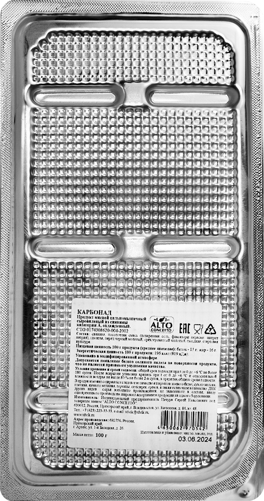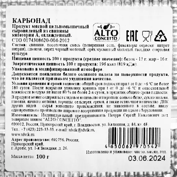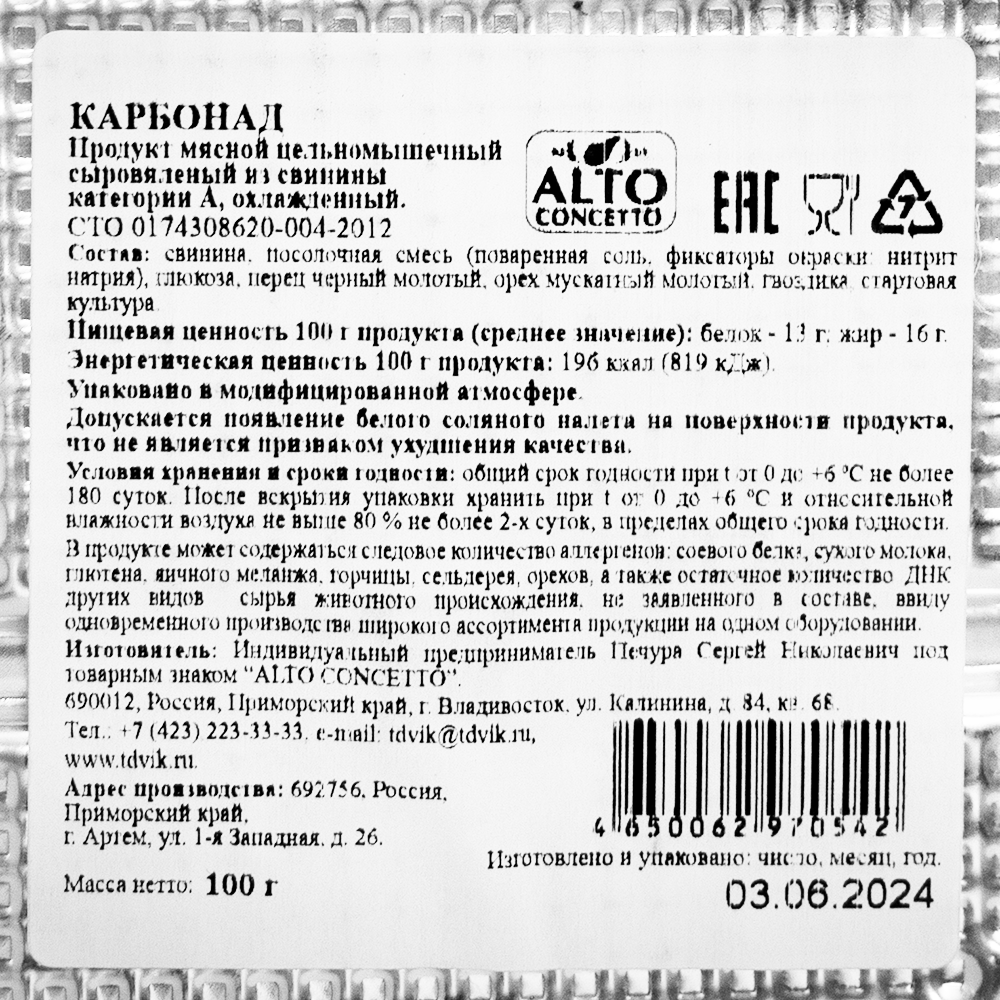 Карбонад сыровяленый из свинины Alto Concetto, нарезка, 100 г