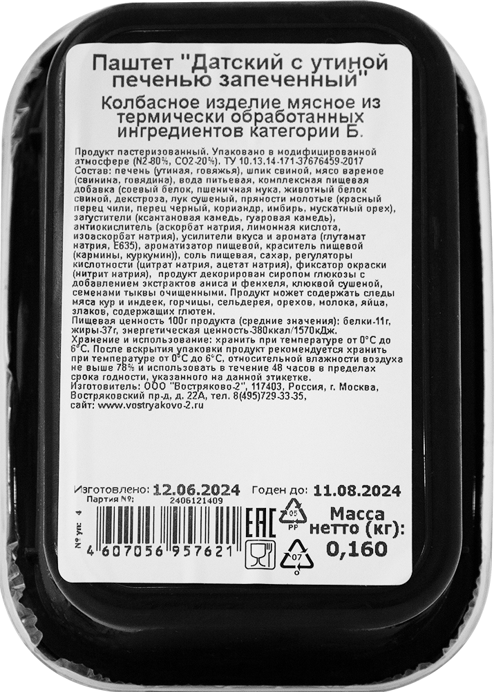печень (утиная, говяжья), шпик свиной, мясо вареное (свинина, говядина), вода питьевая, комплексная пищевая добавка (соевый белок, крахмал пшеничный, молочный белок, клетчатка бамбуковая, сахара (декстроза, сухой глюкозный сироп), пряности натуральные молотые (горчица, сельдерей), загустители (гуаровая камедь, ксантановая камедь), желирующий агент (каррагинан), антиокислители (аскорбат натрия, аскорбиновая кислота, лимонная кислота), регуляторы кислотности (цитрат натрия, ацетат натрия, трифосфат натрия, Е575), стабилизаторы (пирофосфат натрия, полифосфат натрия), усилитель вкуса и аромата (глутамат натрия), ароматизаторы пищевые, краситель натуральный пищевой (кармины)), клюква вяленая, крахмал картофельный, соль пищевая, лук сушеный, фиксатор окраски (нитрит натрия), продукт декорирован сиропом глюкозы с добавлением экстрактов аниса и фенхеля, клюквой вяленой, семечками тыквенными очищенными.