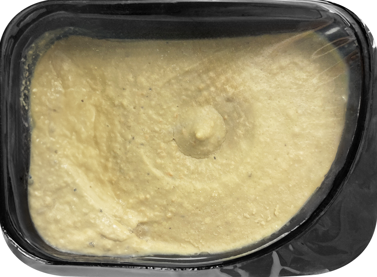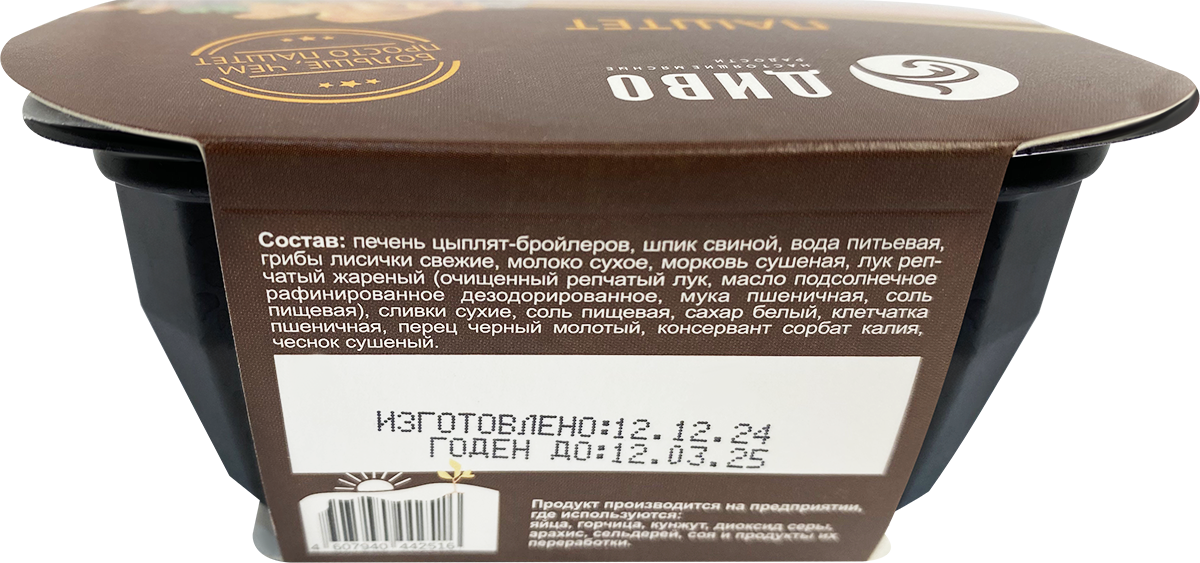 печень цыплят-бройлеров, шпик свиной, вода питьевая, грибы лисички свежие, молоко сухое, морковь сушеная, лук репчатый жареный (очищенный репчатый лук, масло подсолнечное рафинированное дезодорированное, мука пшеничная, соль пищевая), сливки сухие, соль пищевая, сахар белый, клетчатка пшеничная, перец черный молотый, чеснок сушеный, консервант сорбат калия.