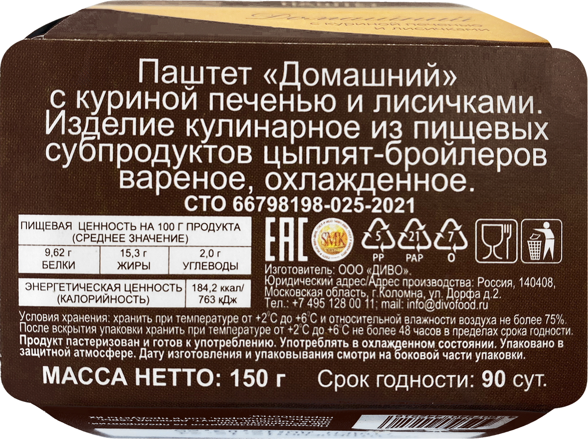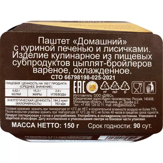 Паштет "Домашний" Диво с куриной печенью и Лисичками, 150 г
