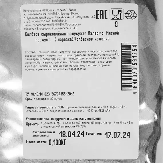 Колбаса сырокопченая Палермо по-Егорьевски, нарезка 100 г