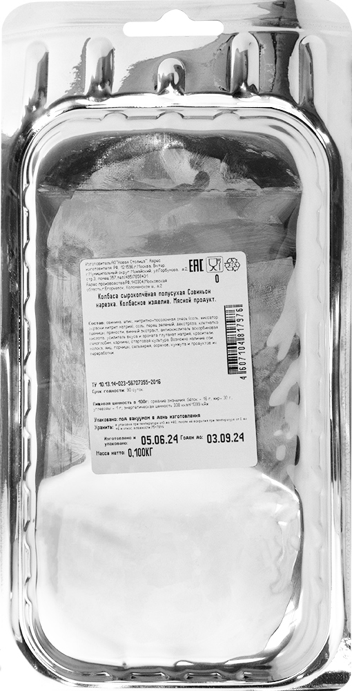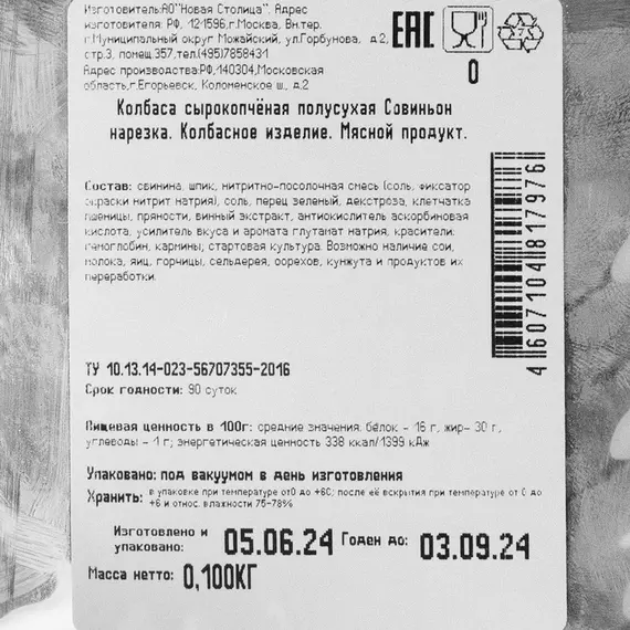 Колбаса сырокопченая Совиньон нарезка, Егорьевска фабрика, 100 г