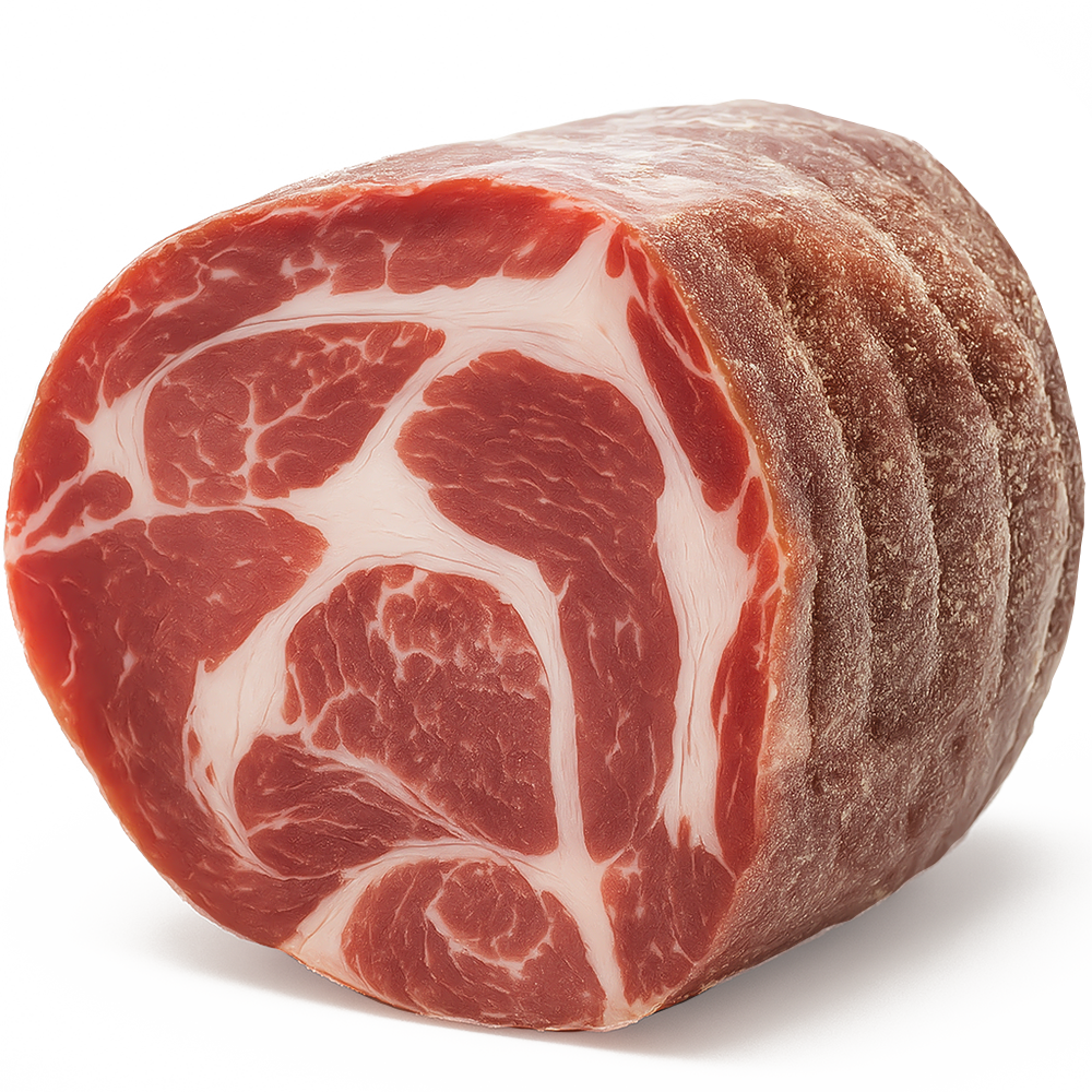Сыровяленая шея идеально подходит для сервировки мясных тарелок, антипасто, бутербродов, пиццы и пасты.