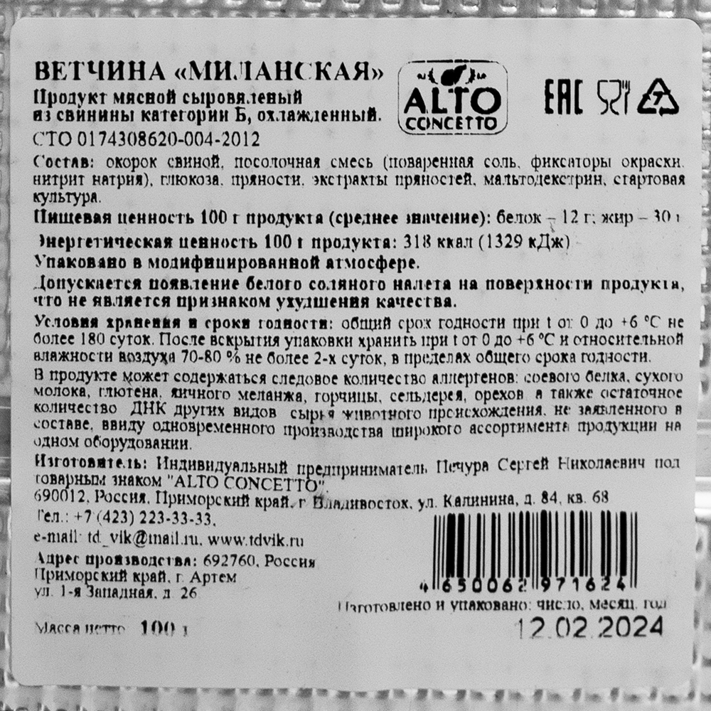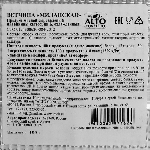 Ветчина "Миланская" ALTO CONCETTO, 100 г