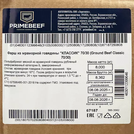 - Производитель — Праймбиф, Россия, лидер по качеству мясной продукции.