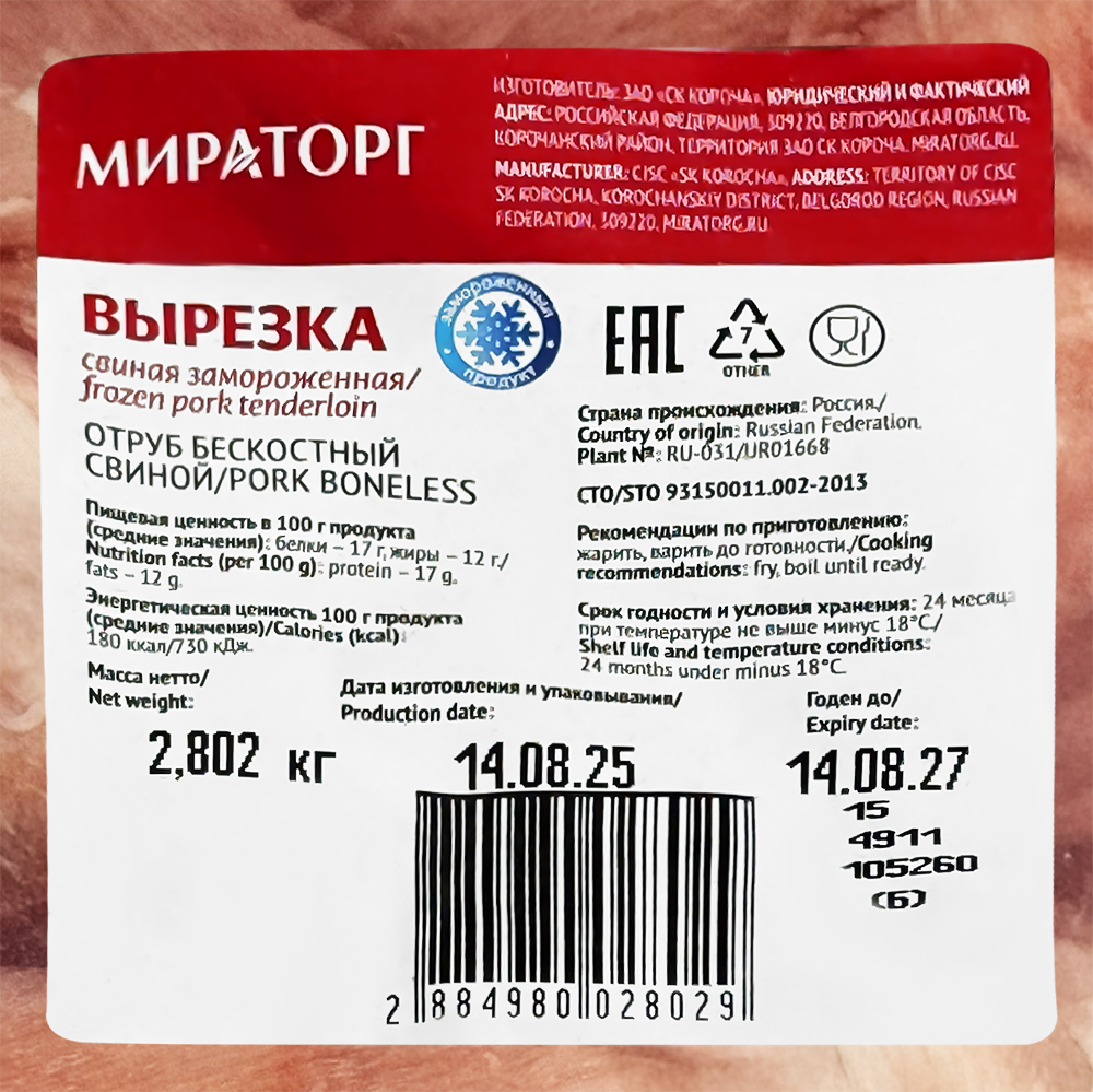 Свинина вырезка свежемороженая, без кости, вакуумная упаковка, Мираторг, ~2,5 кг