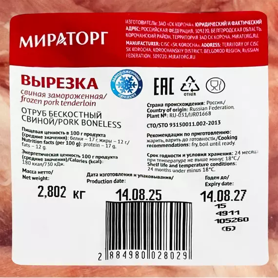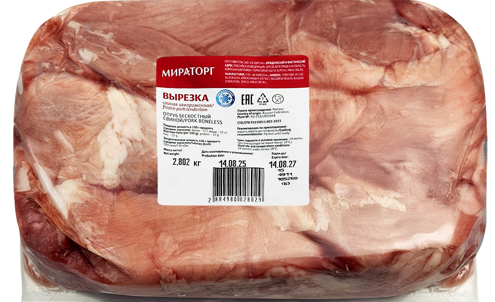 Продукт свежемороженый, упакован в вакуумную упаковку, что обеспечивает сохранность вкуса, сочности и питательных свойств. Вырезка легко нарезается, быстро готовится и сохраняет естественную нежность после термической обработки.