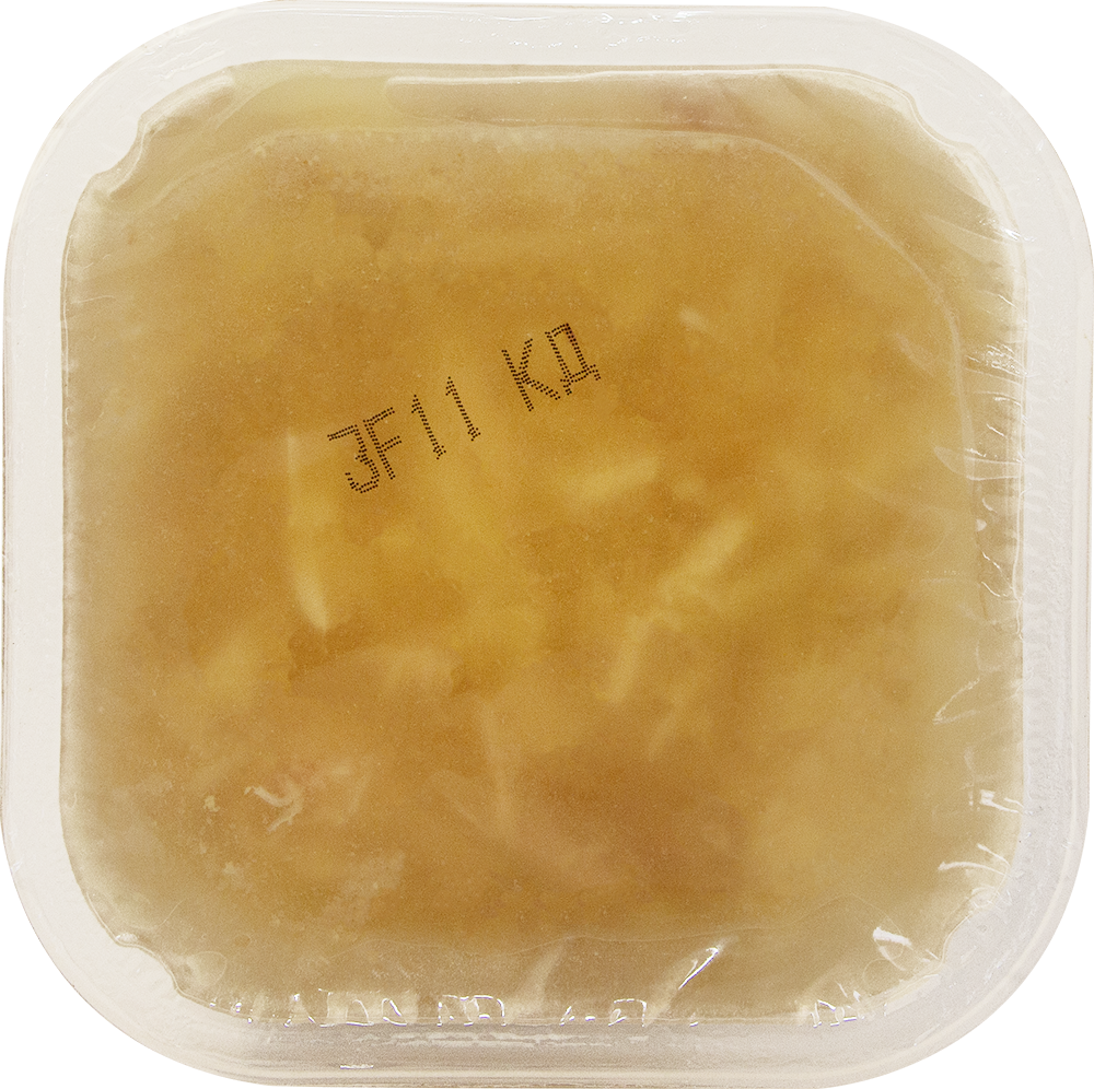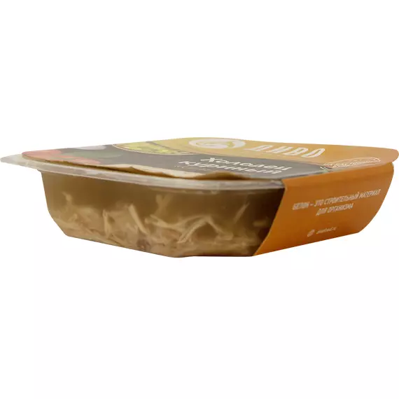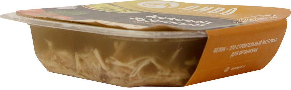 Холодец из куриного мяса, бульона и специй с добавлением желатина. Приготовлен по рецепту, максимально приближенному к домашнему способу приготовления. Высокобелковый, но при этом низкокаллорийный продукт, который мы относим к категории правильного питания
