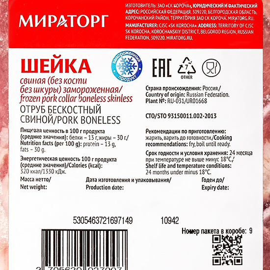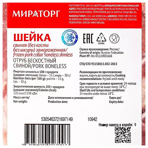 Шейка свиная без кости, свежемороженая Мираторг вакуумная упаковка ~ 3 кг