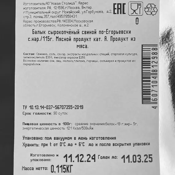 Свинина, соль, сахар, экстракты натуральных специй, стартовая культура, антиокислитель E301, фиксатор окраски E250