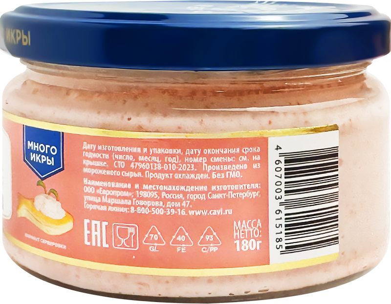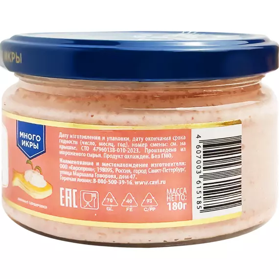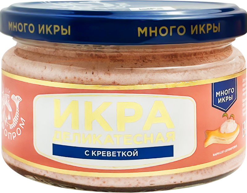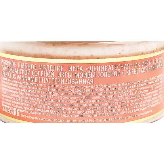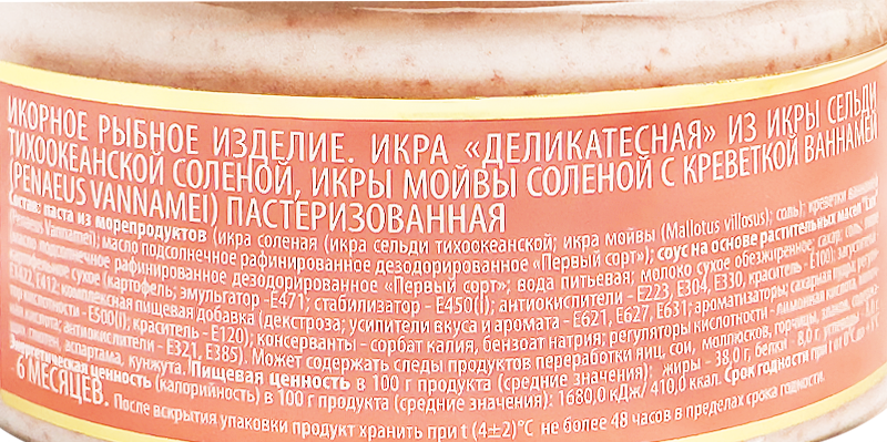 Деликатесная икра на основе икры мойвы и сельди с добавлением мяса креветки и нежного соуса. Мягкий вкус и кремовая текстура.