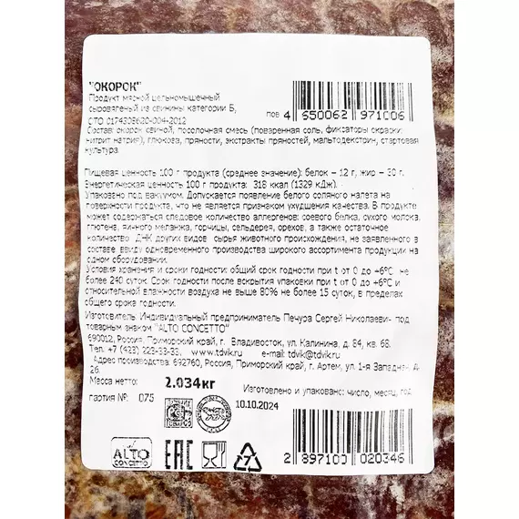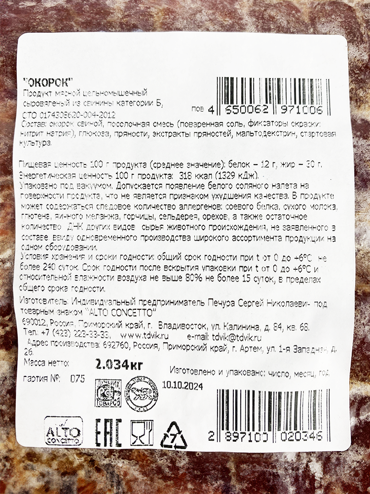 Окорок свиной сыровяленый ALTO CONCETTO, 2 кг