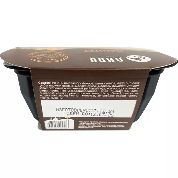 печень цыплят-бройлеров, шпик свиной, вода питьевая, грибы лисички свежие, молоко сухое, морковь сушеная, лук репчатый жареный (очищенный репчатый лук, масло подсолнечное рафинированное дезодорированное, мука пшеничная, соль пищевая), сливки сухие, соль пищевая, сахар белый, клетчатка пшеничная, перец черный молотый, чеснок сушеный, консервант сорбат калия.