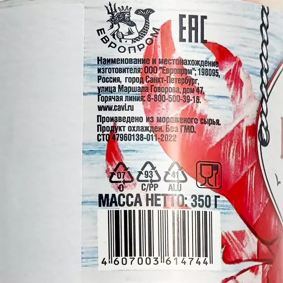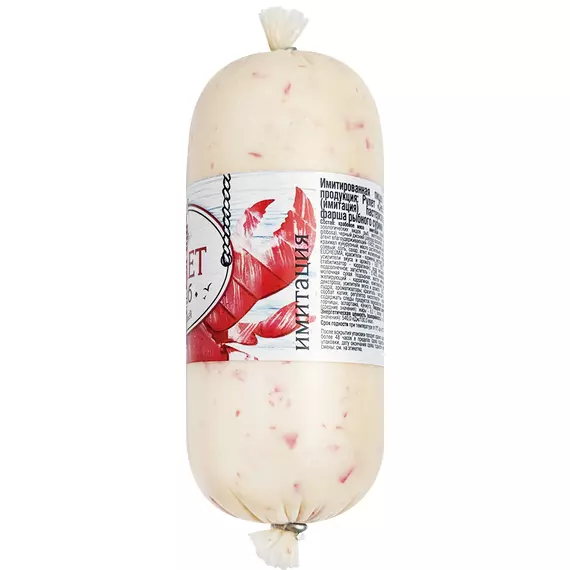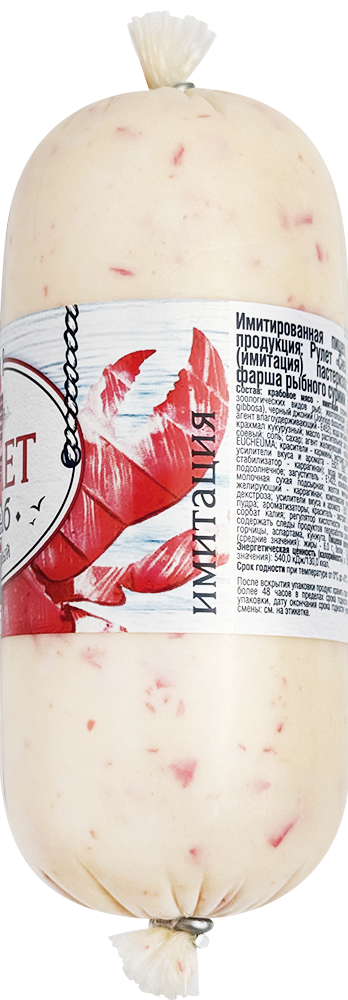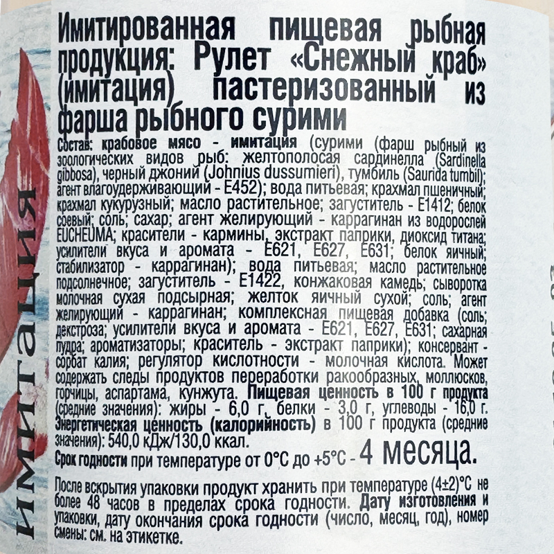 Крабовое мясо - имитация (сурими (фарш рыбный из зоологических видов рыб: желтополосая сардинелла, черный джоний, тумбиль); агент влагоудерживавющий - E452); вода питьевая, крахмал пшеничный, крахмал кукурузный, масло растительное, загуститель - E1412; белок соевый, соль, сахар, агент желирующий - каррагинан из водорослей EUCHEMA, красители - E120, E160c, E171; усилители вкуса и аромата - E621, E627, E631; белок яичный, стабилизатор - E407; вода питьевая, масло растительное, загустители - E1422, E425i; сыворотка молочная сухая подсырная, желток яичный сухой, соль, агент желирующий - E407, комплексная пищевая добавка (декстроза, усилители вкуса и аромата - E621, E627, E631, сахарная пудра, ароматизаторы, краситель - экстракт паприки), регулятор кислотности - E270, консерванты - E202, E211.