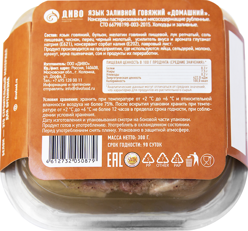 язык говяжий, бульон, желатин говяжий пищевой, лук репчатый, соль пищевая, чеснок, перец черный молотый, усилитель вкуса и аромата глутамат натрия, консервант сорбат калия, лавровый лист.