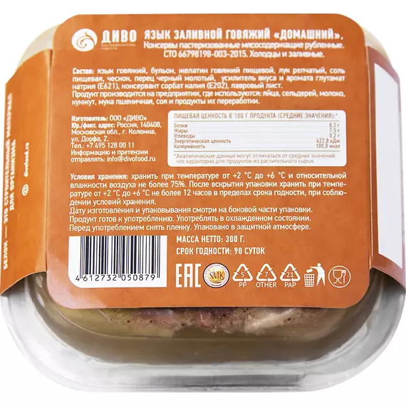 Заливной язык полностью готов к употреблению и не требует дополнительной подготовки. Отлично подходит для праздничного стола, фуршетов, банкетов и ресторанного меню. Традиционная «домашняя» рецептура делает блюдо узнаваемым и востребованным среди ценителей классической кухни.