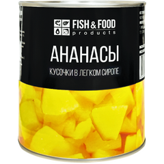 Сочные ананасы кусочки Fish&Food 850 мл / 490 г из Таиланда — в собственном соку, без консервантов. Идеальны для десертов, пиццы и закусок.
